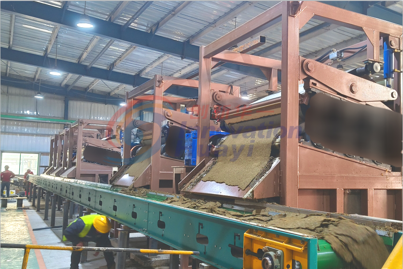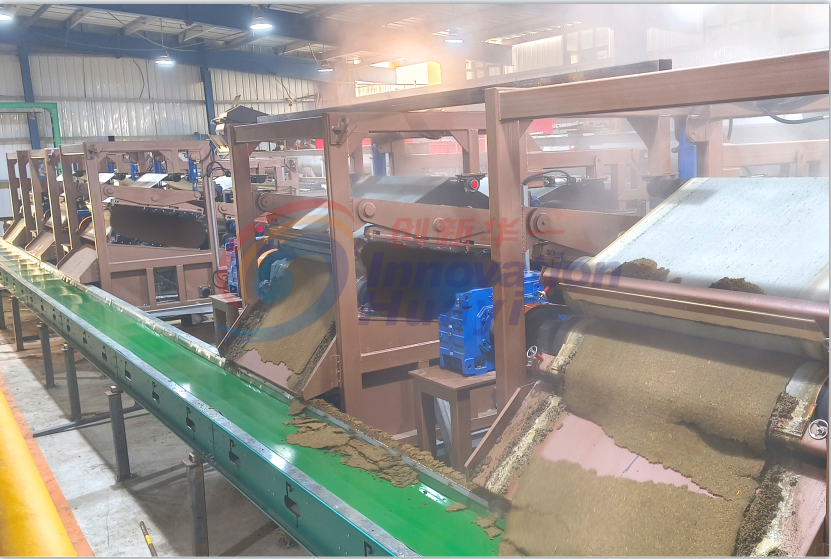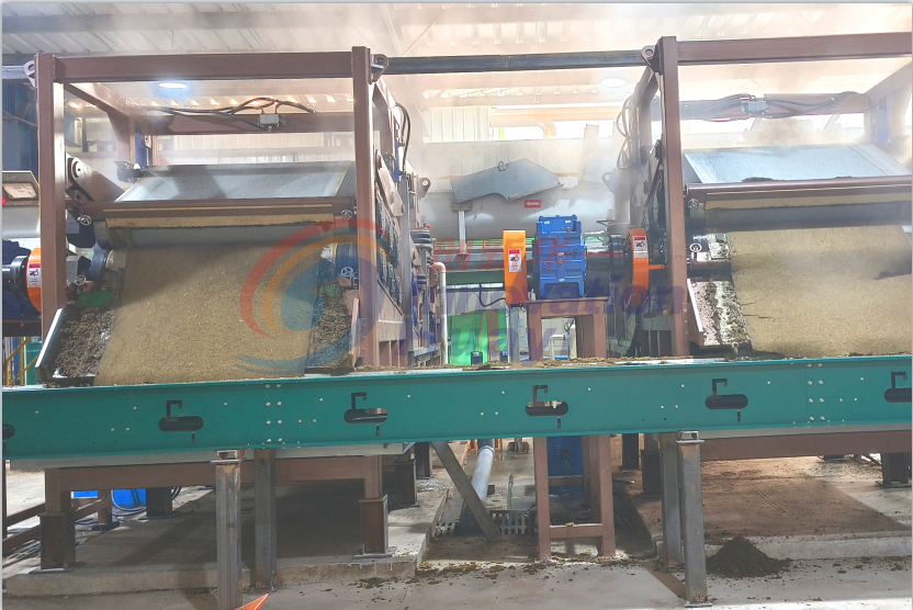 五台全新高压带式压榨过滤机正轰鸣运转。牛粪经过均匀布料装置铺在滤带上,随着设备运行,粪水被迅速挤压分离,排出的滤饼含水率稳定在50%以下,同时完整保留了牛粪中的粗纤维结构。