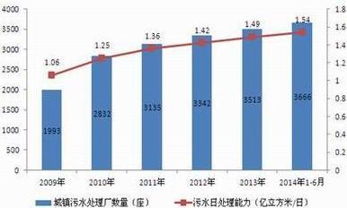 图表1:2009-2014年城镇污水处理市场容量增长情况(单位:座,亿立方米/日)