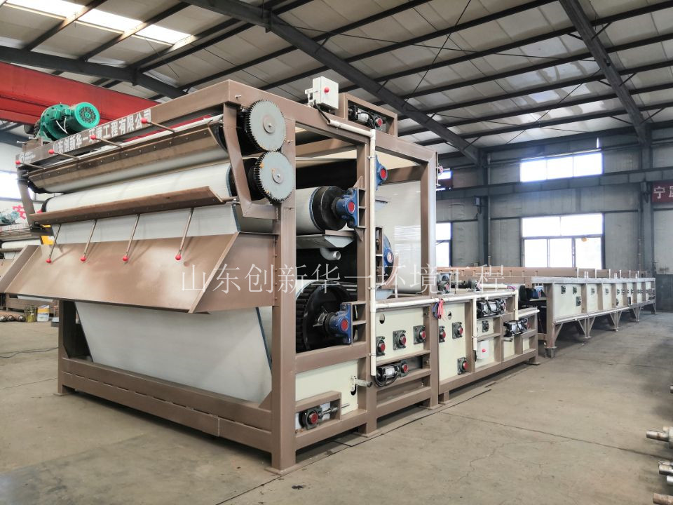 带式压滤机是一种常见的污泥处理设备,属于压力过滤设备。带式压滤机是将经沉淀浓缩的物料在静态混合器中与絮凝剂混合形成絮团并分离出自由水,在上下网带的夹持下,通过由小到大的挤压和剪切作用,释放出絮团内的自由水和毛细管水,形成致密的滤饼,达到固液分离。