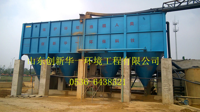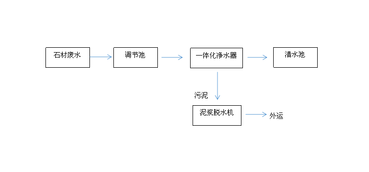 石材废水中主要含有石粉(成分为SiO2、CaO和CaCO3等),少量金刚石细粒、磨料细粒以及冲洗泥砂等。相比磨机废水,锯机和切边机两种废水的水质更加相近,污水中颗粒更粗大且均含有少量的有机冷却剂(主要为皂化物、太古油等)。通过调研和水质分析可知,该废水的特征污染物为悬浮物(SS),污水中颗粒呈悬浮和胶体状态,分散度高。为此,创新华一环保根据石材污水的上述特点专门研发的一体化净水设备,经过大量的实际运行实验,效果非常理想。污泥则用泥浆脱水机处理,形成泥饼,工艺流程如下: