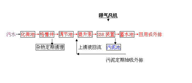 混合废水经污水管流入集水井,经机械粗格栅去除污水中大颗粒固体物质后,进入调节池。再从调节池用泵提升至 SBR 池, SBR 排放的上清液出水经消毒处理自流入污水管道,进入管网。 SBR 所产生的剩余污泥经加药凝聚,在污泥浓缩池内进一步浓缩,浓缩后的污泥泵入贮泥池,污泥定期外运。污泥浓缩池上清液及压缩液返回集水井,进入生化系统再处理。