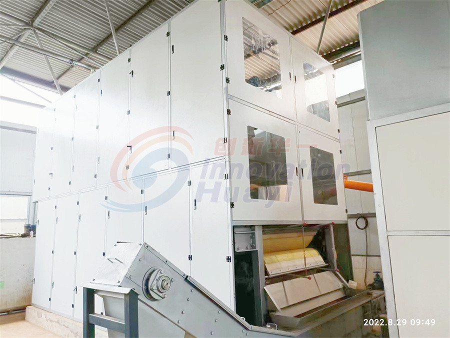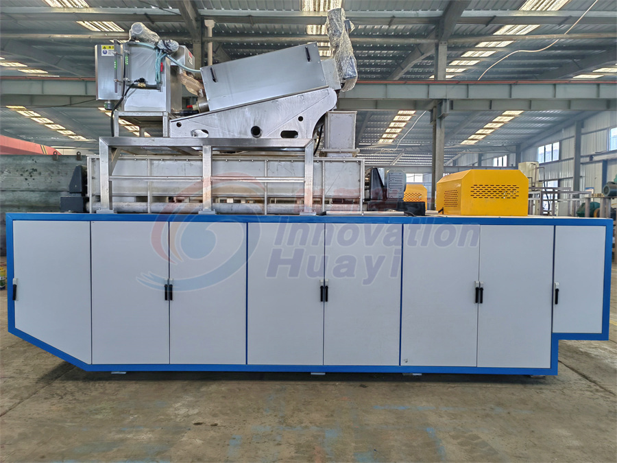 一体式高压带式污泥脱水机,可直接处理含水率98%的市政污泥,该设备浓缩段采用叠螺脱水机,处理后污泥含水率85%左右进入双螺旋混合器,污泥和破壁剂在双螺旋混合器内充分混合后进入2级污泥布料器,经过14根呈S型分布的高压挤压辊处理后,污泥含水率可以降至70%以下,也可通过添加少量石灰将含水率降至60%以下。