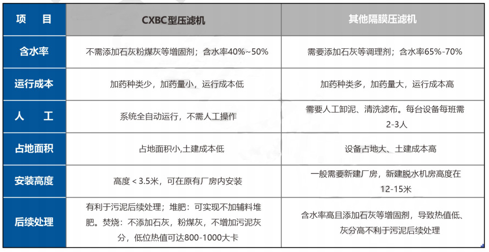CXXB压滤机在脱水过程中不添加石灰、粉煤灰等任何增固剂,不降低污泥的热值,不改变污泥的化学性质,可代替目前现有的污泥脱水系统,实现污泥深度脱水的目标。该深度脱水工艺可以用作任何污泥处置工艺的预处理工艺,提高污泥后续的处理效率、减少后续污泥处理量、降低后续处理成本和处理难度。