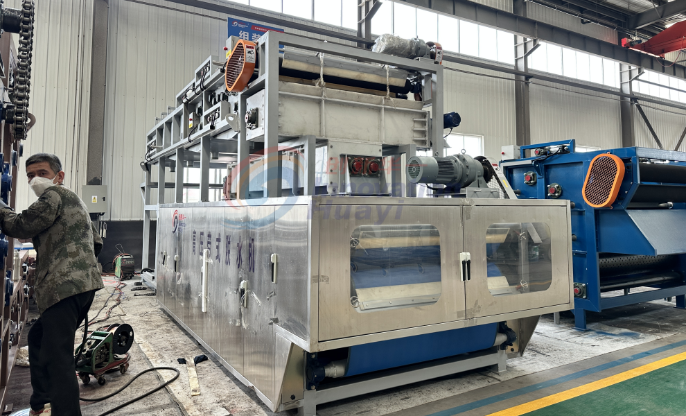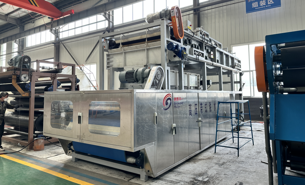 该设备是我公司在传统带式压滤机基础上,研发生产的全新一代污泥深度脱水机。设备增加了液压装置、污泥布料装置,优化了调偏装置、冲洗装置和轴承座。新型超高压带式污泥脱水机脱水能力更强,可以在不添加或者少添加辅料的情况下,将污泥含水率降至60%以下。