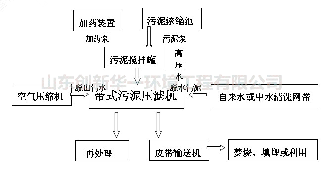 3、 污泥经加药处理后先送至浓缩段,经过几十秒种浓缩处理后污泥浓度达到2%-10%以上(视操作要求而定),然后经过污泥配料装置送到压滤脱水段,然后形成具有一定含固率的泥儿饼。