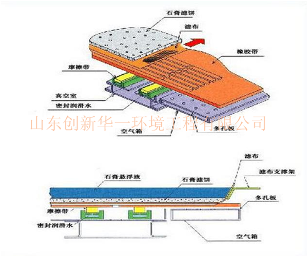 连续带式真空过滤机以滤布为过滤介质,是充分利用物料重力和真空吸力实现固液分离的分离设备,采用整体的环形橡胶带作为真空室环形胶带由电机拖动连续运行,滤布铺敷在胶带上与之同步运行,胶带与真空滑台,上环形摩擦带接触并形成水密封,料浆由布料器均匀地布在滤布上。当真空室接通真空系统时,在胶带上形成真空抽滤区,滤液穿过滤布经胶带上的横沟槽汇总并由小孔进入真空室,固体颗粒被截留在滤布上形成滤饼,进入真空室的液体经汽水分离器排出,随着橡胶带的移动已形成滤饼依次进入滤饼洗涤区和洗干区,然后滤布与胶带分开,在卸料轴处将滤饼卸出,卸出滤饼的滤布经清洗获得再生,在经过一组支撑轴和纠偏装置后重新进入过滤区,开始进入新一过虑区。