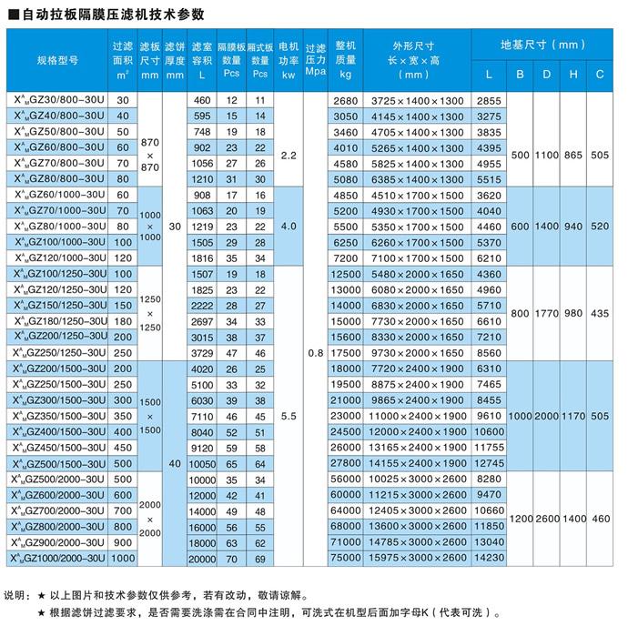 隔膜压榨压滤机是由隔膜板和厢式滤板排列组成滤室,在输料泵的压力作用下将料浆输入滤室,通过过滤介质(滤布)将料浆中的固体和液体分离,当料浆中的固体形成饼后,再向隔膜通入空气,对滤室内的固体充分压榨。降低含水率。尤其对于粘性物料的过滤及对含水率要求较高的用户,此机更有其独特的特性。滤板采用增强聚丙烯模压而成,隔膜与聚丙烯板镶嵌在一起,坚固牢靠、不易脱落、使用寿命长。其中配有多种安全装置,确保操作人的安全和压滤机的正常运行。