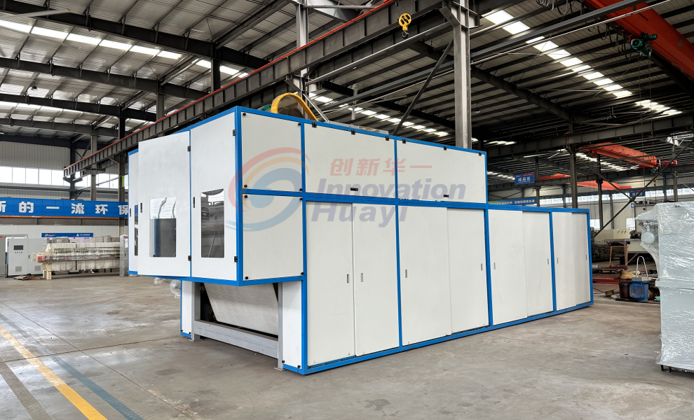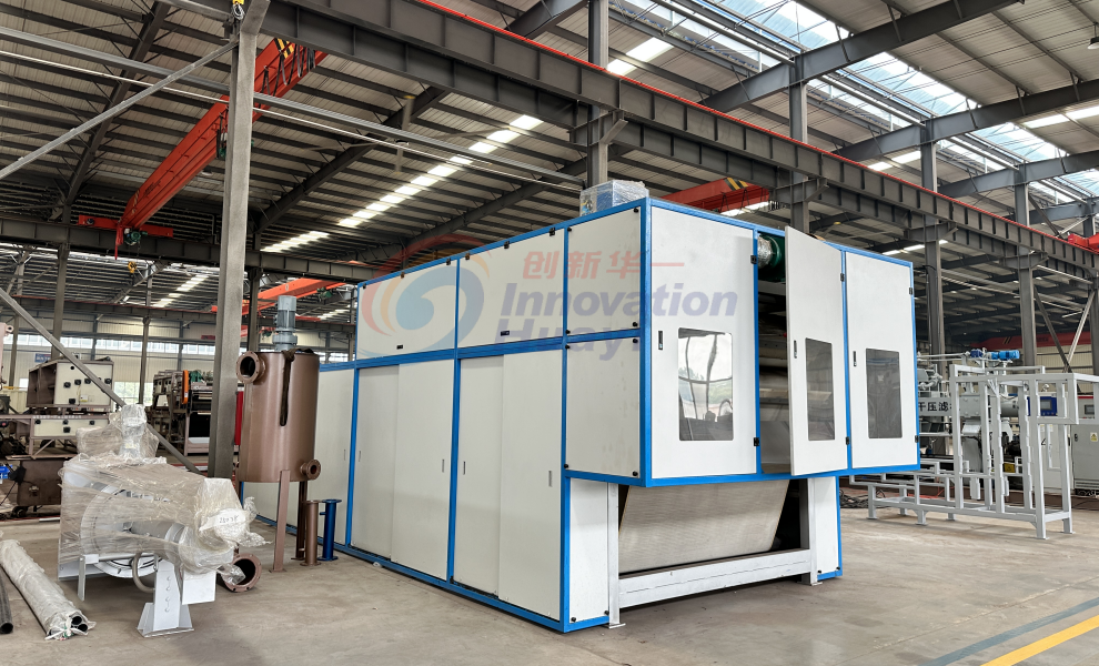 该设备是我公司在传统带式压滤机基础上,研发生产的全新一代污泥深度脱水机。设备增加了液压装置、污泥布料装置,优化了调偏装置、冲洗装置和轴承座。新型超高压带式污泥脱水机脱水能力更强,可以在不添加或者少添加辅料的情况下,将污泥含水率降至60%以下。
